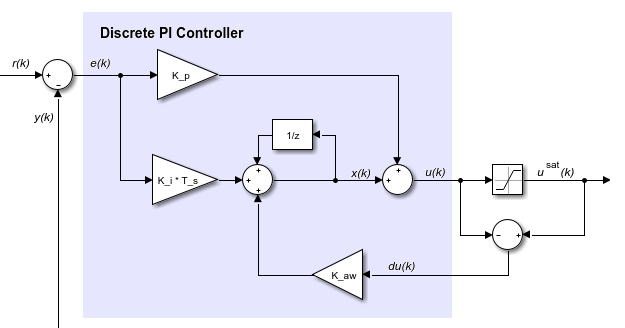 Для предотвращения чрезмерного перестрелки блок может использовать обратный расчет для реализации внешнего противообмоточного механизма. Он вводит du (k), разность между насыщенным управляющим сигналом usat (k) и вычисленным ненасыщенным управляющим сигналом u (k). Затем он умножает разность на коэффициент противодействия намотке и добавляет усиленный сигнал из интегрального коэффициента усиления.