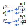 Когда коммутатор открыт, порты p1 и p2 подключаются к портам n11 и n21 соответственно.