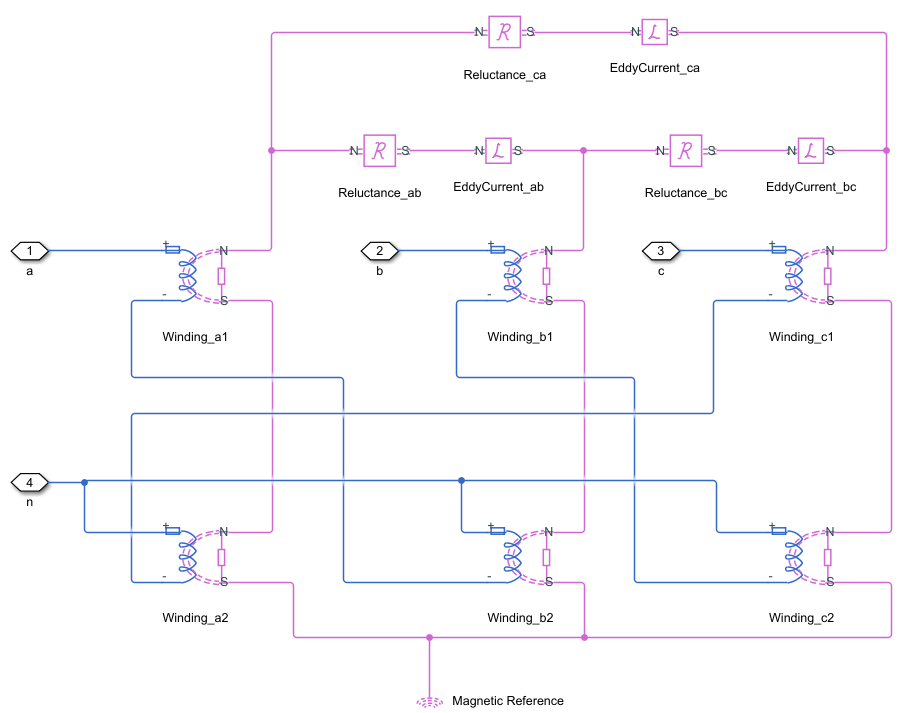 Этот блок реализован как в электрической, так и в магнитной областях, представляющих физику фазных обмоток и магнитопровода. Эквивалентная цепь для блока включает обмотки, сопротивления и вихревые токи.