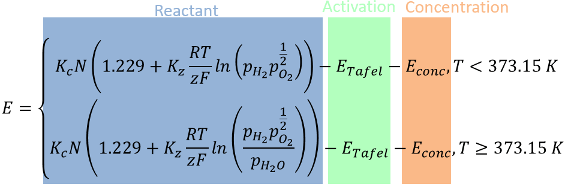 Если для параметра «Точность модели» задано значение Simplified - nominal conditionsблок топливного элемента вычисляет напряжение Нернста, E, при номинальном условии температуры и давления, как определено следующими уравнениями: