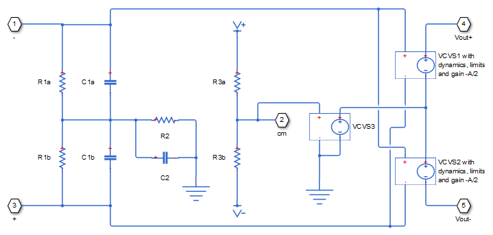 Блок Fully Differential Op-Amp моделирует полностью дифференциальный операционный усилитель. Дифференциальная передача сигнала лучше, чем односторонняя передача за счет снижения восприимчивости к внешним источникам шума. Приложения включают в себя сбор данных, где входы являются дифференциальными, например, сигма-дельта преобразователи.