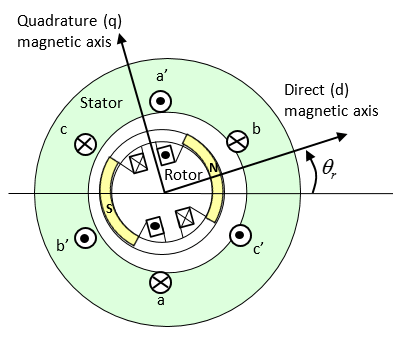 На схеме показана конструкция двигателя с одной полюсной парой на роторе. Для условного обозначения осей, когда механический угол λ r ротора равен нулю, потоки α - фазы и постоянного магнита выравниваются. Блок поддерживает определение второй оси ротора, для которой механический угол ротора определяется как угол между α - фазной магнитной осью и q-осью ротора.