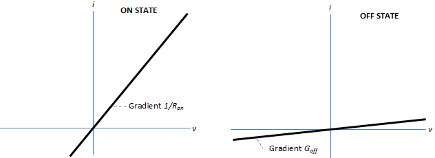 На рисунке показана типичная i-v характеристика для идеального полупроводникового переключателя.