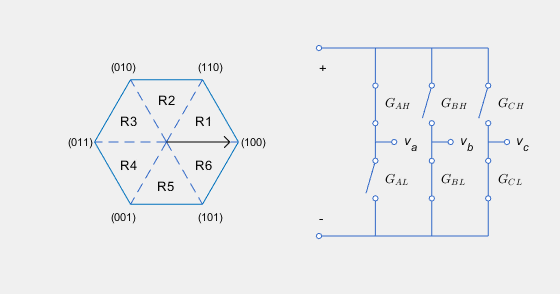 Шестиугольник представляет диаграмму пространственных векторов. Каждая из шести вершин представляет возможное состояние переключения (GAH, GBH, GCH) трехфазного инвертора. Каждый низкий затвор принимает противоположное состояние в качестве соответствующего высокого затвора. Схема инвертора иллюстрирует текущее состояние.