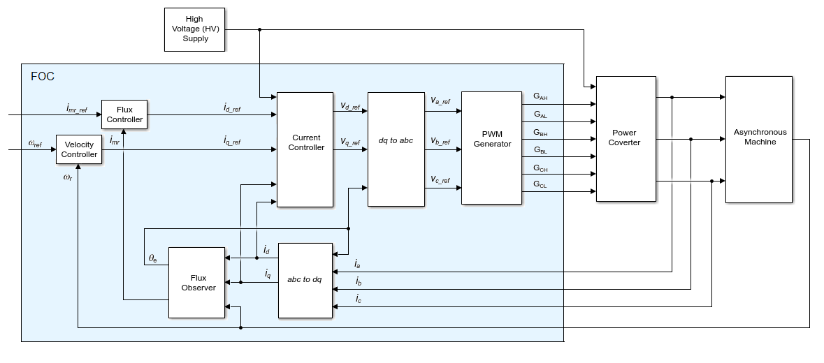 Блок полеориентированного контроллера индукционной машины реализует структуру полеориентированного управления индукционной машиной (ВОК) с использованием системы на единицу измерения. Для разъединения крутящего момента и потока ВОК использует опорную рамку ротора d-q. На рисунке показана структура управления.