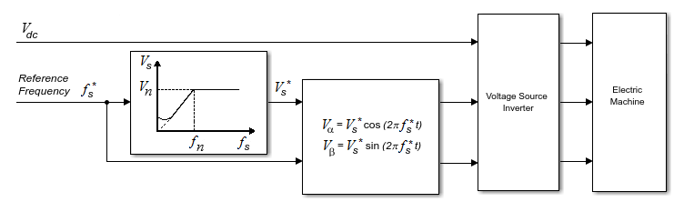 Блок скалярного управления индукционной машиной реализует скалярную структуру управления индукционной машиной, то есть V/f или V/Hz. На схеме показана структура управления V/f с разомкнутым контуром, реализованная блоком.