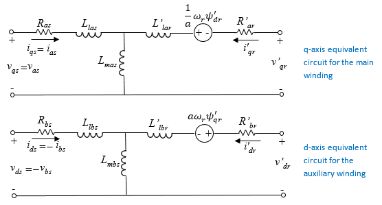 Однофазная индукционная машина состоит из несущего ротора и двух статорных обмоток, основной и вспомогательной обмоток. Вспомогательная обмотка обычно активна только во время пуска. Однако для повышения производительности вспомогательная обмотка может быть активной во время работы для приложений с низким энергопотреблением. На рисунке показаны эквивалентные d- и q-осевые цепи для основной и вспомогательной обмоток.