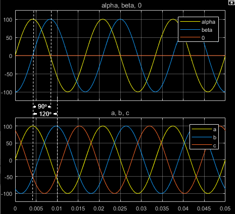 Блок обратного преобразования Кларка преобразует альфа, бета и нулевые компоненты временной области в стационарном опорном кадре в трехфазные компоненты в abc опорном кадре. Блок может сохранять активную и реактивную мощности с мощностями системы в стационарном опорном кадре, реализуя инвариантную версию мощности обратного преобразования Кларка. Если нулевая составляющая равна нулю, компоненты в трехфазной системе сбалансированы.