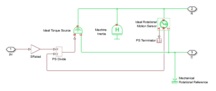 На рисунке показана конфигурация, эквивалентная модели исполнения блока Mechanical Power Machine с использованием Simscape™ компонентов механического вращения.