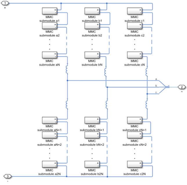 Модульный многоуровневый преобразователь (трехфазный) моделирует трехфазный модульный многоуровневый преобразователь. Каждая фаза состоит из двух плеч, которые реализованы с рядом последовательно соединенных подмодулей мощности.