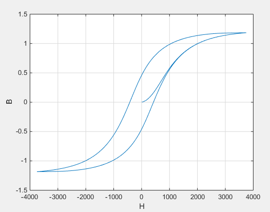 Начните с α очень маленького и постепенно увеличивайте значение B при пересечении линии H = 0. Типичное значение находится в диапазоне от 1e-4 до 1e-3. Слишком большие значения приведут к тому, что градиент кривой B-H будет стремиться к бесконечности, которая является нефизической и порождает ошибку утверждения во время выполнения.