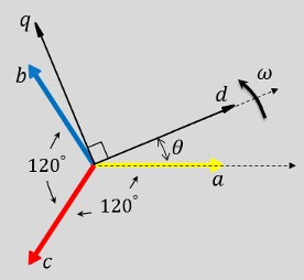 d и q - компоненты двухосной системы в вращающейся опорной раме.