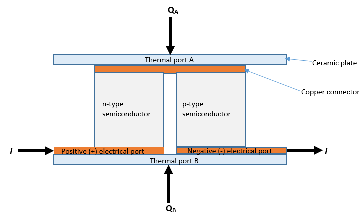 Когда блок действует как охлаждающее устройство, положительный ток вызывает протекание тепла от порта A к порту B, охлаждающий порт A относительно порта B.