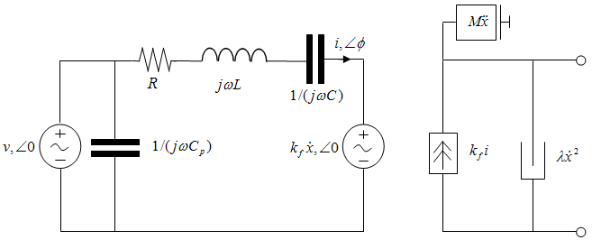 Когда двигатель активен, блок линейного привода Пьезо представляет характеристики двигателя с использованием следующей эквивалентной модели цепи.