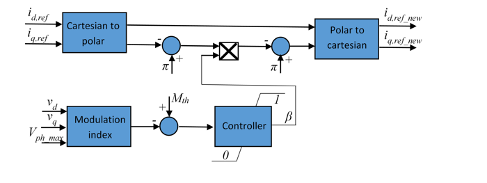 Этот блок используется для регулировки угла опорного вектора тока, чтобы удовлетворить фазовым ограничениям напряжения.