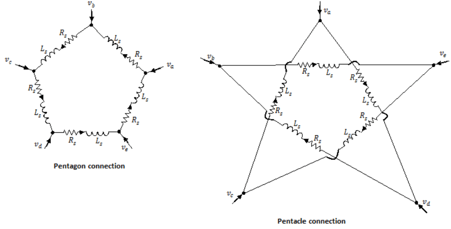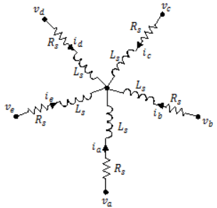 Блок PMSM (пятифазный) моделирует синхронный двигатель постоянного магнита со статором с пятифазной звездой. На рисунке показана эквивалентная электрическая цепь для обмоток статора со звездой.