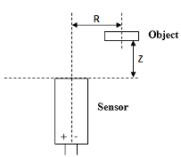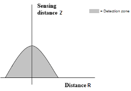 Блок датчика близости представляет собой простой датчик близости. Измерительное расстояние Z определяется как расстояние по нормали к поверхности датчика, на котором датчик обнаруживает объект для данного радиального смещения R, как показано на следующем рисунке.