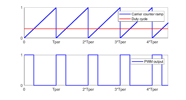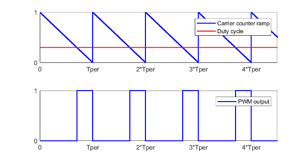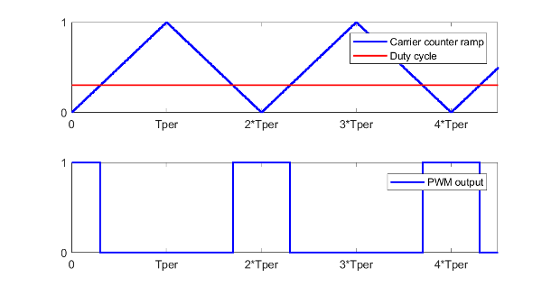 Блок генератора ШИМ выводит либо 1 когда рабочий цикл превышает значение счетчика несущей, или 0 в противном случае. Можно задать период каждого цикла, указав период таймера Tper. Можно изменить начальный выходной сигнал или фазу выходного сигнала ШИМ, указав один из трех типов счетчиков несущих: