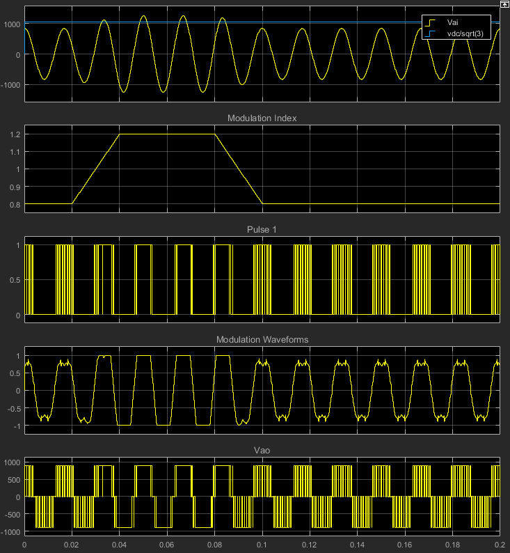 В примере трехфазного трехуровневого генератора ШИМ подсистема трехуровневого контроллера содержит вход 1800-V DC-канала и индекс модуляции m, равный 0,8. Для SVM максимальное входное напряжение равно 1800/3V, то есть 1039,23 В. Для демонстрации перемодуляции в начале моделирования добавляется переходный процесс. Переходный процесс заставляет амплитуды опорных напряжений превышать амплитуду напряжения линии постоянного тока. Для выделения сверхмодуляции объем включает в себя результаты моделирования только для одного из 12 выходных импульсов и только для α - фазы опорных напряжений, сигналов модуляции и выходных напряжений.