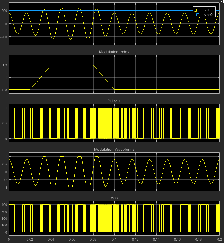 В примере трехфазного двухуровневого ШИМ-генератора подсистема двухуровневого контроллера содержит вход 400-V DC-канала и индекс модуляции m, равный 0,8. Для SPWM максимальное входное напряжение составляет 400 V/2, то есть 200 В. Для демонстрации перемодуляции в начале моделирования добавляется переходный процесс. Переходный процесс заставляет амплитуды опорных напряжений превышать амплитуду 1/2 напряжения линии постоянного тока. Для выделения сверхмодуляции объем включает в себя результаты моделирования только для одного из шести выходных импульсов и только для α - фазы опорных напряжений, сигналов модуляции и выходных напряжений.