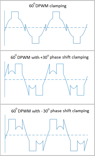 Выбор положительного или отрицательного 30-градусного фазового сдвига влияет на интервалы зажима для 60-градусного DPWM.