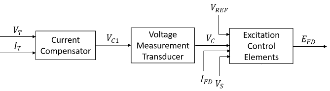 Компонент «Элементы управления возбуждением» сравнивает выходной сигнал преобразователя напряжения с опорным напряжением клеммы для получения ошибки напряжения. Эта ошибка напряжения затем проходит через регулятор напряжения для создания напряжения возбуждения возбудителя.