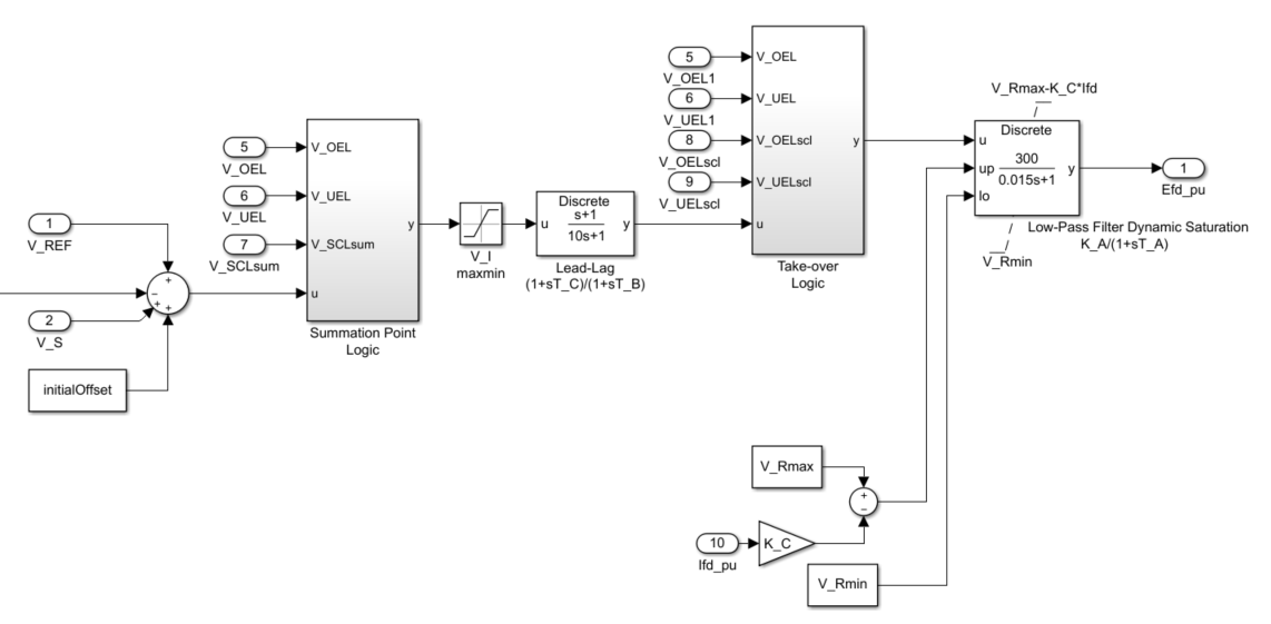 Подсистема логики точки суммирования моделирует входное местоположение точки суммирования для напряжений ограничителя сверхвыпуска (OEL), ограничителя недозволенности (UEL) и ограничителя тока статора (SCL). Дополнительные сведения об использовании ограничителей с этим блоком см. в разделе Ограничения тока поля.