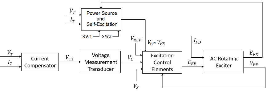 Компонент «Элементы управления возбуждением» сравнивает выходной сигнал преобразователя напряжения с опорным напряжением клеммы для получения ошибки напряжения. Эта ошибка напряжения затем проходит через регулятор напряжения для создания напряжения возбуждения возбудителя.