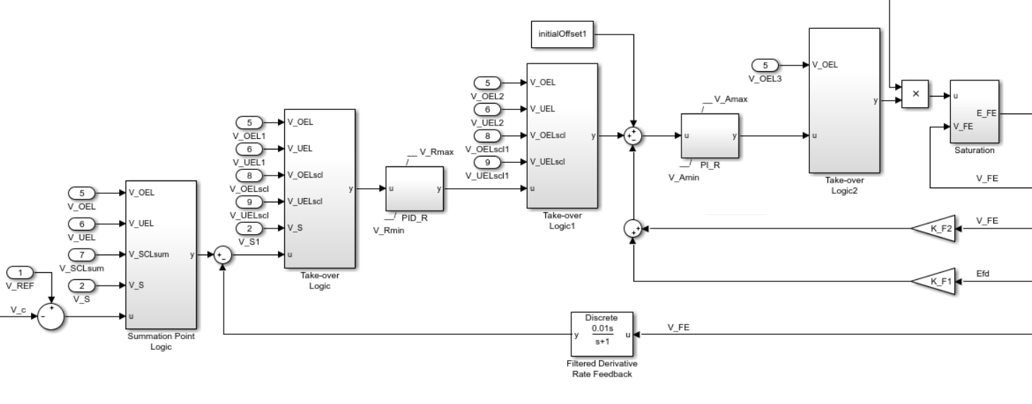 Существует три подсистемы Take-over Logic. Они моделируют места ввода точек приема для напряжений OEL, UEL, SCL и PSS. Дополнительные сведения об использовании ограничителей с этим блоком см. в разделе Ограничения тока поля.