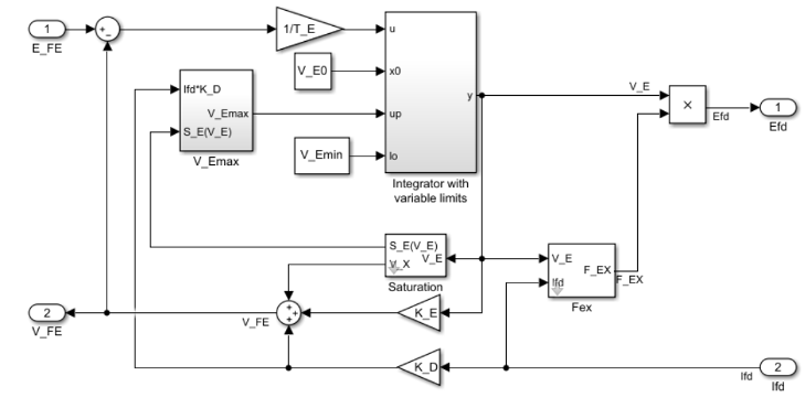 Интегратор с подсистемой переменных предельных значений интегрирует разность между EFE и VFE для формирования выходного напряжения VE возбудителя переменного тока. TE - постоянная времени для этого процесса.