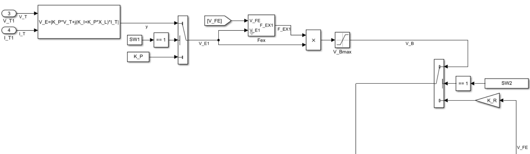 Компонент «Элементы управления возбуждением» сравнивает выходной сигнал преобразователя напряжения с опорным напряжением клеммы для получения ошибки напряжения. Эта ошибка напряжения затем проходит через регулятор напряжения для создания напряжения возбуждения возбудителя.