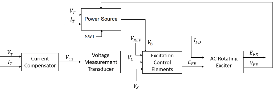 Вращающийся возбудитель переменного тока моделирует вращающийся возбудитель переменного тока, который создает напряжение поля, которое подается на управляемую синхронную машину. Блок также подает ток поля возбудителя (который имеет стандартный символ VFE) обратно в систему возбуждения.