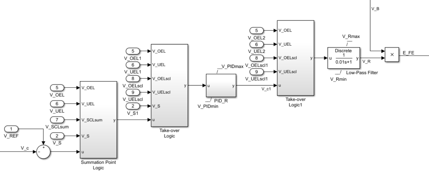Подсистема логики точки суммирования моделирует входное местоположение точки суммирования для ограничителя чрезмерного возбуждения (OEL), ограничителя недостаточного возбуждения (UEL), ограничителя тока статора (SCL) и напряжения переключателя питания (V_S). Дополнительные сведения об использовании ограничителей с этим блоком см. в разделе Ограничения тока поля.
