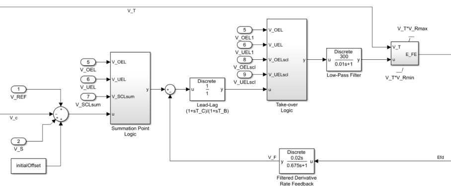 Подсистема логики точки суммирования моделирует входное местоположение точки суммирования для напряжений ограничителя сверхвыпуска (OEL), ограничителя недозволенности (UEL) и ограничителя тока статора (SCL). Дополнительные сведения об использовании ограничителей с этим блоком см. в разделе Ограничения тока поля.