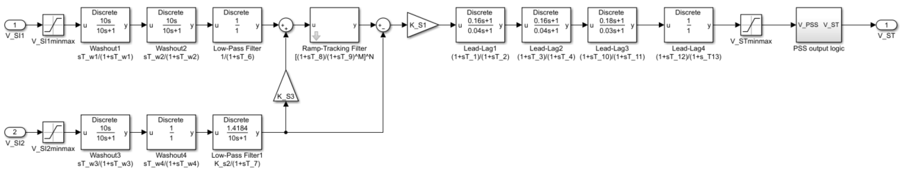 Два блока вымывания (дискретный или непрерывный) представлены для каждого входа стабилизатора с постоянными времени, TW1 к TW4, вместе с преобразователем, представленным фильтром нижних частот (дискретным или непрерывным), с постоянными времени T6 и T7.