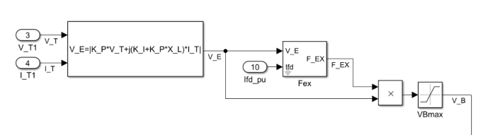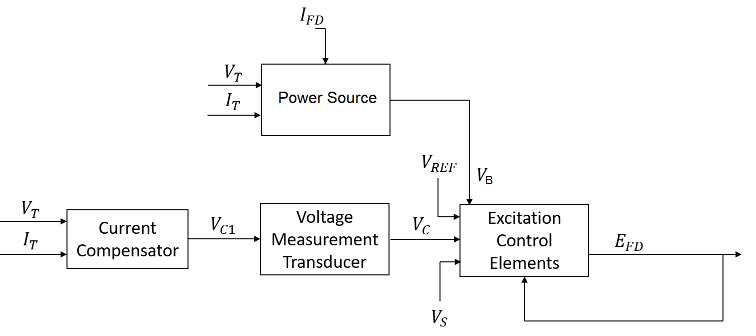 Компонент «Элементы управления возбуждением» сравнивает выходной сигнал преобразователя напряжения с опорным напряжением клеммы для получения ошибки напряжения. Эта ошибка напряжения затем проходит через регулятор напряжения для получения напряжения поля.
