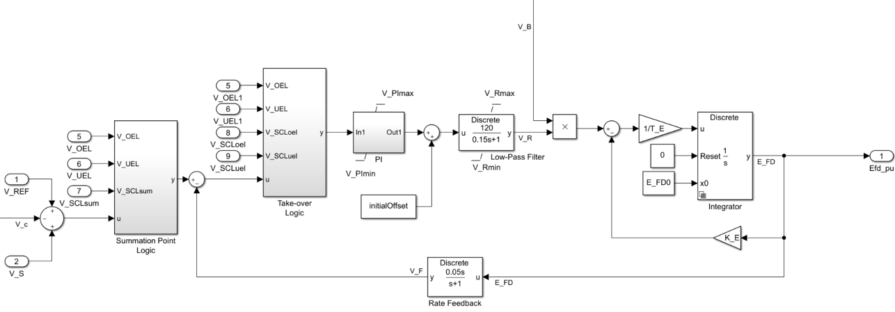 Подсистема Take-over Logic моделирует местоположение входа точки приема для напряжений OEL, UEL и SCL. Дополнительные сведения об использовании ограничителей с этим блоком см. в разделе Ограничения тока поля.