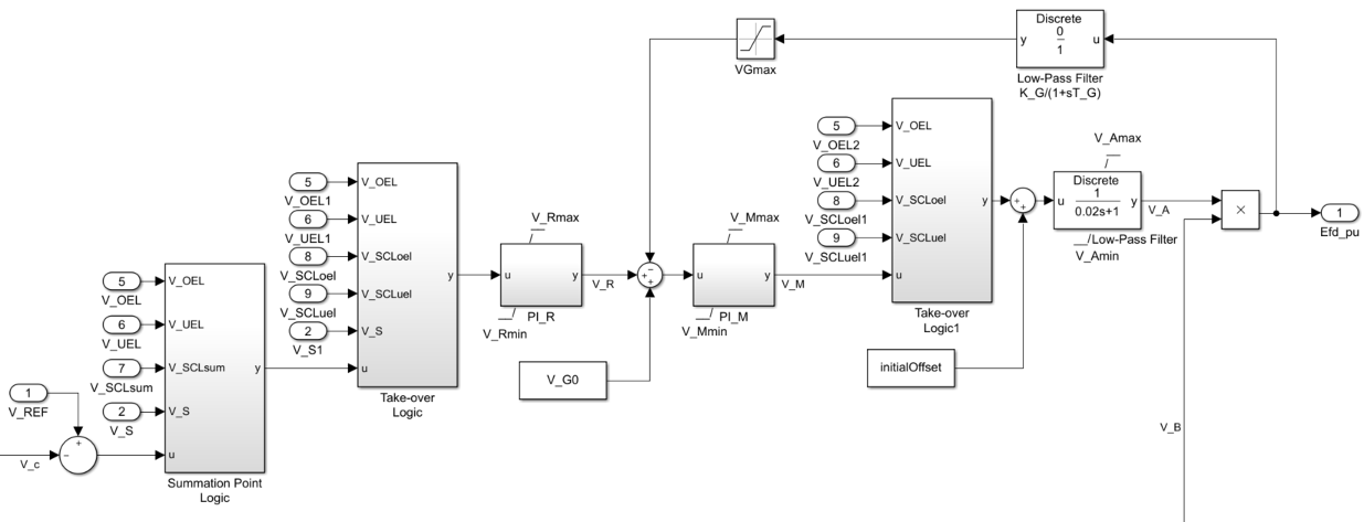 Внутренний контур управления напряжением поля используется для линеаризации характеристики управления возбудителем и состоит из коэффициентов усиления KM и KG и постоянных времени TM и TG. Минимальными и максимальными предельными значениями насыщения фильтра нижних частот являются VAmin и VAmax соответственно.