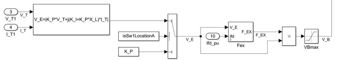 Компонент «Элементы управления возбуждением» сравнивает выходной сигнал преобразователя напряжения с опорным напряжением клеммы для получения ошибки напряжения. Эта ошибка напряжения затем проходит через регулятор напряжения для получения напряжения поля.