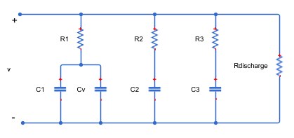 Конденсаторы C1, C2 и C3 имеют фиксированные емкости. Емкость конденсатора Cv зависит от напряжения на нем. Резисторы R1, R2 и R3 имеют фиксированные сопротивления. Напряжение на каждом отдельном фиксированном конденсаторе в блоке суперконденсатора рассчитывается как