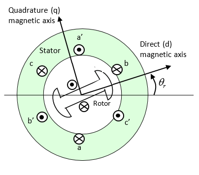 На схеме показана конструкция двигателя с одной полюсной парой на роторе. Для условного обозначения осей, когда механический угол λ r ротора равен нулю, потоки α - фазы и постоянного магнита выравниваются. Блок поддерживает определение второй оси ротора, для которой механический угол ротора определяется как угол между α - фазной магнитной осью и q-осью ротора.