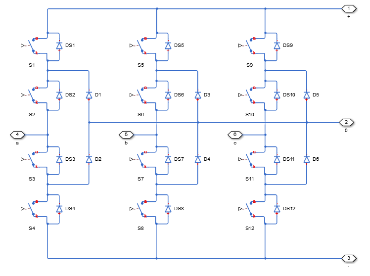 Трехуровневый преобразователь (трехфазный) моделирует двенадцатиимпульсный трехфазный трехуровневый нейтрально-точечный управляемый преобразователь. Этот блок можно использовать для подключения трехфазной сети переменного тока к трехуровневой сети постоянного тока.