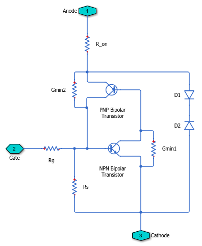 Структуру P-N-P-N тиристора согласуют структуры P-N-P и N-P-N биполярных транзисторов, база каждого устройства соединена с коллектором другого устройства. Чтобы эта схема вела себя как тиристор, необходимо выбрать подходящие значения параметров NPN и PNP устройств, а также внешние резисторы. Например, для того, чтобы схема защелкнулась во включенное состояние, после запуска соответствующим током затвора, суммарный коэффициент усиления двух транзисторов должен быть больше единицы. Эта структура модели воспроизводит поведение тиристора в типичных схемах приложения, в то же время представляя минимальное количество уравнений решателю, чтобы улучшить скорость моделирования.