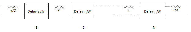 Для введения потерь, второй вариант, Delay-based and lossy, последовательно соединяет N компонентов на основе задержки, каждый из которых определяется вышеприведенными уравнениями, через набор резисторов, как показано на следующей иллюстрации.