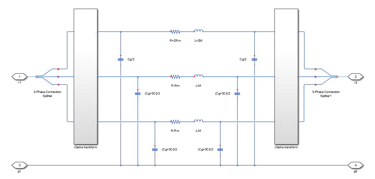 Блок «Линия передачи» (трехфазная) моделирует трехфазную линию передачи с использованием модели пи-линии с сумматором. Эта модель учитывает фазовое сопротивление, фазовую самоиндукцию, линейную взаимную индуктивность и сопротивление, линейную емкость и линейную емкость.