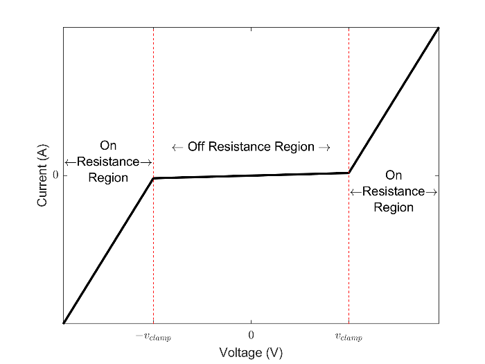 vclamp - пороговое напряжение, разделяющее две области работы. Задайте это значение с помощью параметра Напряжение зажима (Clamping voltage).