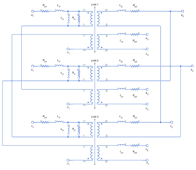 Блок Zigzag-Delta-Wye Transformer моделирует линейный неидеальный трансформатор с сердечником из трех конечностей, который имеет первичные зигзагообразные обмотки и вторичные обмотки дельта, wye или delta и wye. Можно задать фазовое смещение между зигзагообразными и wye-обмотками с помощью параметра Wye secondary phase shift и параметризовать импеданс блока с использованием значений на единицу. Блок включает эффекты утечки линейной обмотки и намагниченности линейного сердечника.