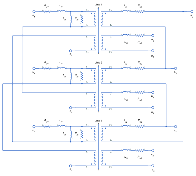 Линейный, неидеальный зигзаг-дельта-wye трансформатор с трехгубым сердечником с возможностью насыщения