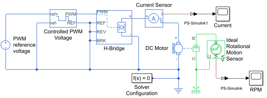 В этом примере моделируется двигатель постоянного тока, приводимый в действие постоянным входным сигналом, который аппроксимирует широтно-импульсный модулированный сигнал, и просматривается текущее и вращательное движение на выходе двигателя.