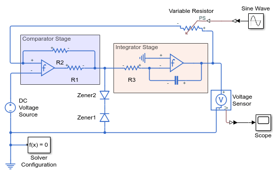 Для генерации треугольной волны используется классическая конфигурация схемы, состоящая из интегратора и неинвертирующего усилителя, а для задания параметров блока используются таблицы данных. Дополнительные сведения см. в разделе Параметризация блоков из таблиц данных.